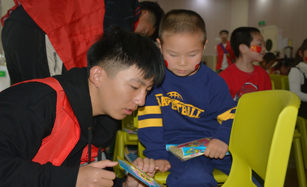 在一起合唱完歌曲之后,志愿者为小朋友们贴上了五星红旗。今年是新中国成立70周年,五星红旗被祖国的花朵衬托的格外明媚。我们的志愿者们向小朋友们普及国旗知识。