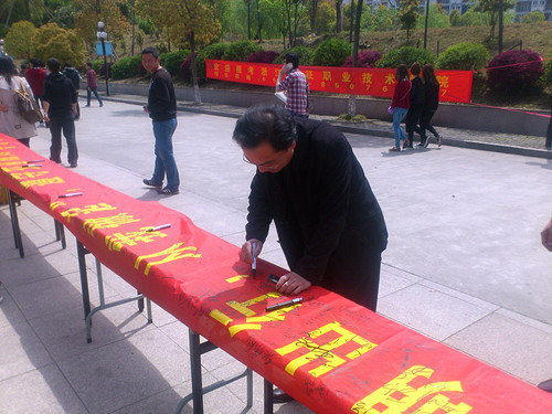 活动伊始,党委副书记王其军带头在条幅上签下自己的名字,随后各系党总支负责人以及广大师生也纷纷在条幅上签下了自己的名字。此次活动以大量的图片和文字,向全校师生积极宣传了遵守交通规则,文明出行的重要性。