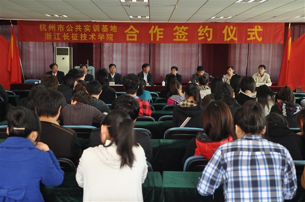 2010年11月11日上午10:30,学院与杭州市公共实训基地举行合作签约仪式。学院执行院长吕振合、正院级巡视员、教学指导委员会主任洪永铿、副院长杜宝山、傅建辉;杭州市公共实训指导中心主任陈苗根、副主任卢红华等领导出席了合作签约仪式,信息系、商务系、贸易系、计算机系和语言系的负责人和专业教研室主任及部分学生代表120多人参加了合作签约仪式。